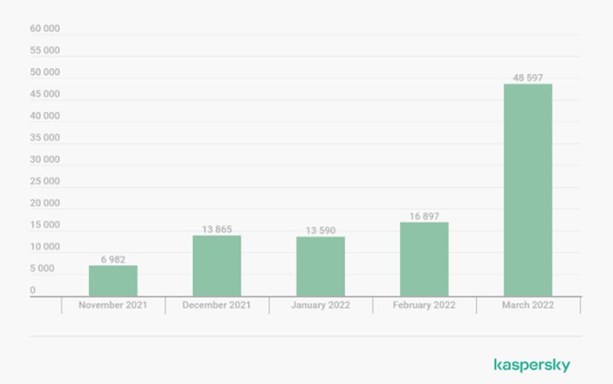 Las tecnologías de Kaspersky muestran que el número total de víctimas se triplicó en tan solo un mes: de 2,843 en febrero de 2022 a 9,086 en marzo de este mismo año. En cuanto al número de bloqueos, el crecimiento fue proporcional y la empresa registró 16,897 intentos de infección en febrero y 48,597 en marzo. Considerando sólo los países latinoamericanos, México ocupa la segunda posición entre las naciones afectadas y Brasil la cuarta en el ranking global, con un aumento de 14,000 bloqueos a 357,000 entre febrero y marzo y de 4,000 a 52,000 en el mismo periodo, respectivamente. Otros países afectados son Colombia (35º), Chile (40º), Paraguay (48º), Ecuador (50º), Uruguay (54º), Argentina (62º), Perú (66º) y Cuba (75º).