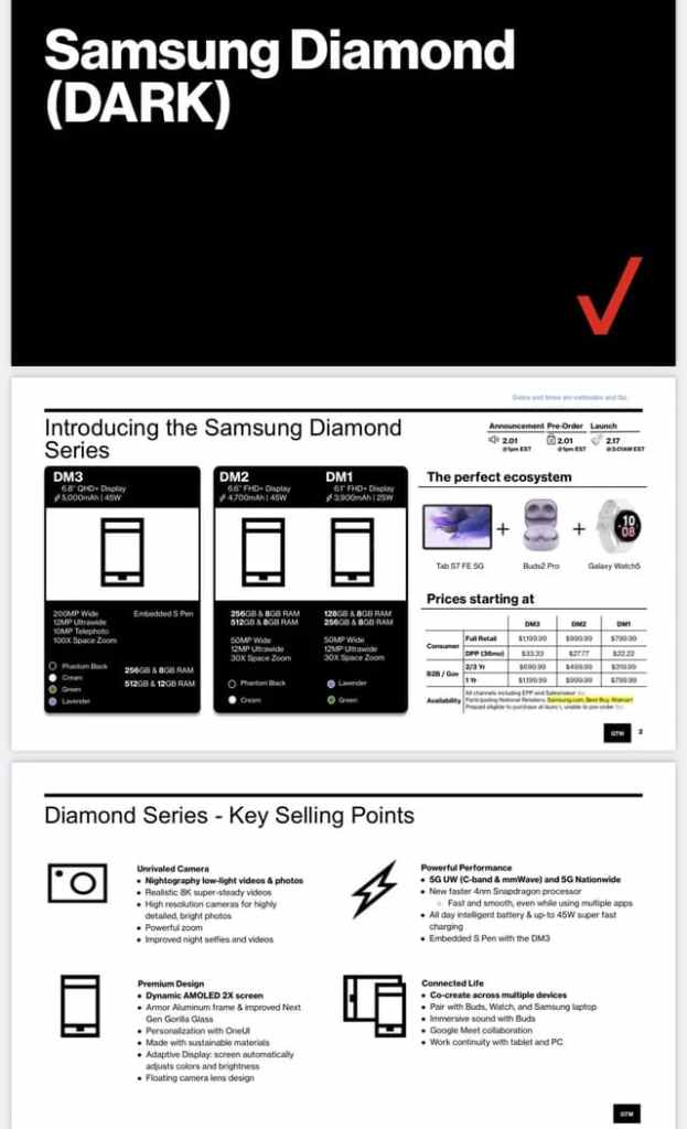Samsung Diamond parece ser el nombre en clave interno de la nueva serie S23, siendo DM1 el Galaxy S23, mientras que DM2 es el S23+ y DM3 es el S23 Ultra. El Galaxy S23 de referencia comenzará a USD 799 para el ajuste de almacenamiento de 8 GB de RAM y 128 GB. Samsung también ofrecerá una versión de 8/256 GB del S23, aunque la lista no proporciona detalles de precios.