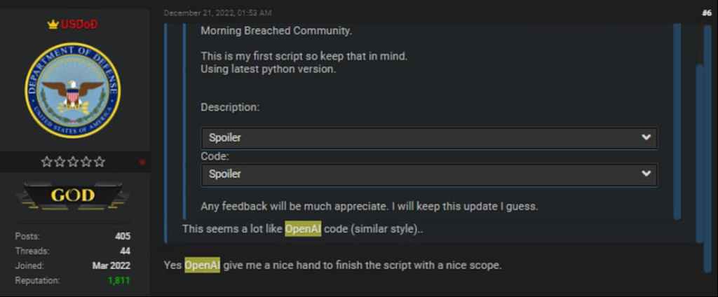 - Creación de una herramienta de cifrado multicapa: el 21 de diciembre de 2022, un ciberdelincuente apodado USDoD publicó un script en Python al que se refirió como «primer script que había creado». Cuando otro ciberdelincuente comentó que el estilo del código se parecía al código de OpenAI, USDoD confirmó que OpenAI le echó una «buena [mano] para terminar el script con un buen alcance». Esto podría significar que los ciberdelincuentes potenciales que tienen poca o ninguna habilidad de desarrollo, podrían aprovechar ChatGPT para desarrollar herramientas maliciosas y convertirse en atacantes con capacidades técnicas. Por supuesto, todo el código mencionado puede utilizarse de forma benigna. Sin embargo, este script puede modificarse para cifrar un equipo sin ninguna interacción del usuario. Por ejemplo, podría convertir el código en ransomware.