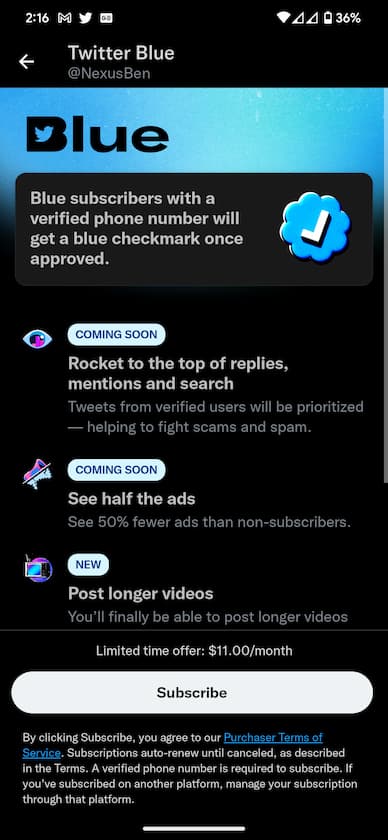 Desafortunadamente, los beneficios de Blue siguen siendo escasos para los suscriptores. Aparte de la marca de verificación azul, los otros beneficios de Blue, como anuncios reducidos, se enumeran próximamente.