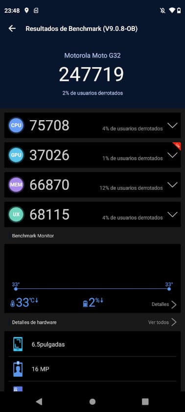 El Motorola Moto G32 es el sucesor del Moto G31 lanzado en el 2021, donde realiza un cambio importante como lo es el micro (de Mediateg a Qualcomm). Cuenta con una pantalla LCD de 6.5 pulgadas a resolución FHD+ y tasa de refresco de 90Hz, el Moto G32 está potenciado por un procesador Snapdragon 680 junto con 4GB 128GB (la version disponible en Argentina) de almacenamiento interno expandible. La cámara posterior es triple, con un sensor principal de 50MP y la cámara selfie es de 16MP. Ademas suma una amplia batería de 5000 mAh con carga rápida de 33W, que completa sus características con parlantes stereo, lector de huellas lateral, resistencia a salpicaduras y corre Android 12.