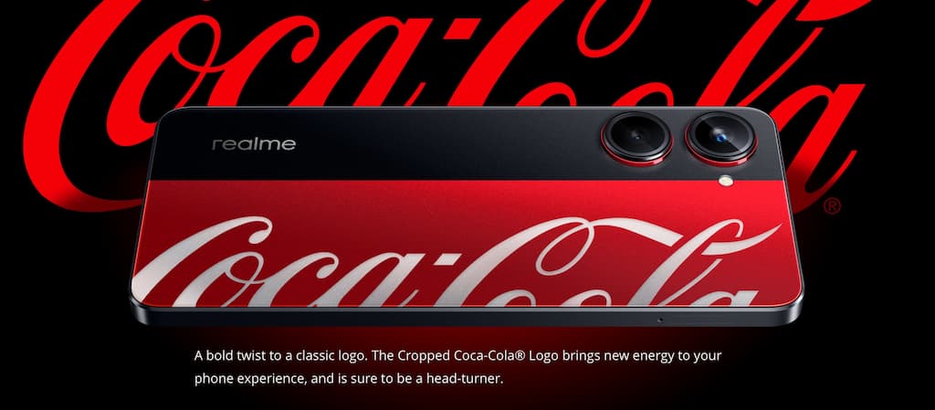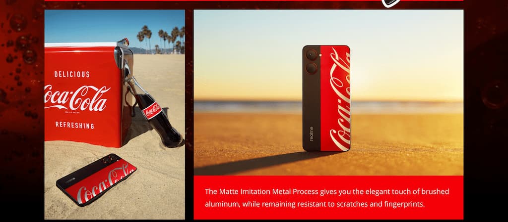 Ademas el equipo cuenta con una animación de carga personalizada que imita el llenado de una botella de coca cola, un fondo de pantalla con gas y un conjunto de íconos que solo está disponible en estas unidades Realme 10 Pro. A todo esto se le suman sonidos de notificación personalizados y un tono de llamada con el tema de Coca-Cola.