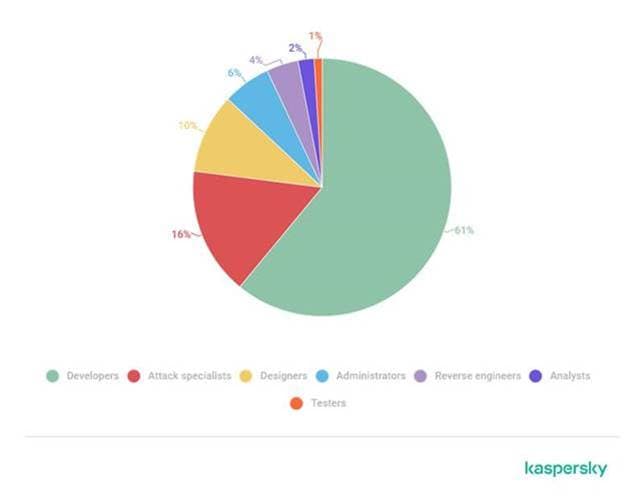 Los desarrolladores fueron los especialistas más solicitados en la Darknet: esta especialidad representó el 61% de todos los anuncios. Dentro de esta especialidad, los desarrolladores web, que crean varios productos web como páginas de phishing, fueron los más buscados y representaron el 60% de estos anuncios. También se valoraron los codificadores de malware. Esta descripción de trabajo puede incluir el desarrollo de troyanos, ransomware, ladrones, puertas traseras, botnets y otros tipos de malware, junto con la creación y modificación de herramientas de ataque.