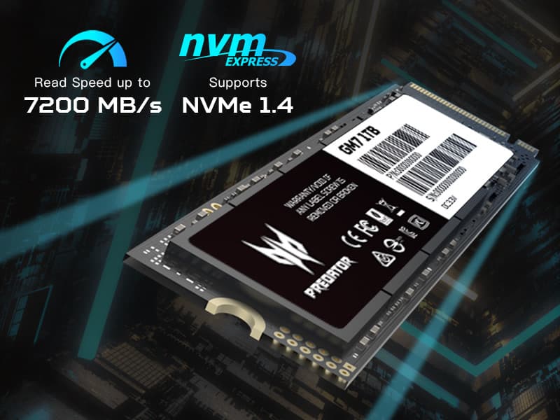 El Predator GM7 dispone de un controlador PCI Express Gen 4.0 (NVMe 1.4) fabricado en avanzada tecnología de 12 nm. Permite una alta velocidad de lectura de datos, de hasta 7200 MB/s, que asegura una carga rápida de juegos y aplicaciones.