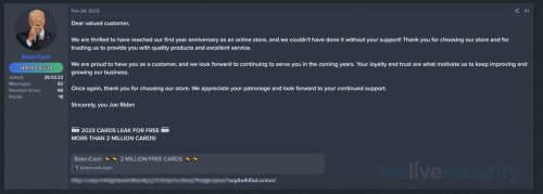 BidenCash es un sitio que está activo desde el 28 de febrero de 2022 y ya ha utilizado otras veces la filtración de bases de datos como una estrategia para promocionar sus servicios. En octubre hizo lo mismo con una base de datos que contenía más de 1.2 millones de tarjetas de crédito.
