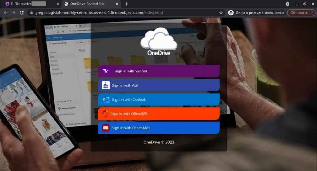El enlace conduce a una web de phishing que imita la página de Microsoft OneDrive. Los ciberdelincuentes la usan para robar credenciales de cuentas de correo como Yahoo!, AOL, Outlook, Office 365 y muchas otras plataformas.