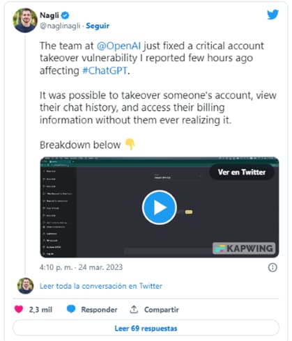 Pie de imagen: Gal Nagli relató que informó al equipo de @OpenAI sobre una vulnerabilidad de adquisición de cuenta crítica (ya corregida) que afectaba a #ChatGPT y permitía apoderarse de una cuenta, ver su historial de chat y acceder a la información de facturación.