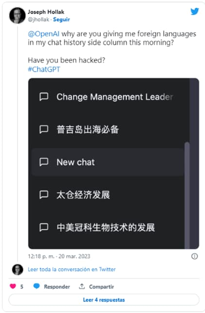 Pie de imagen: Un usuario consulta a OpenAI si ha sido hackeado porque le mostraba idiomas extranjeros en la columna lateral de su historial de chat.