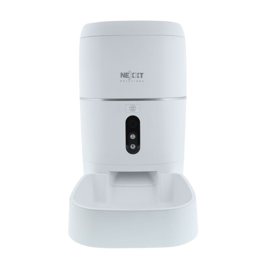 El Dispensador Inteligente de Nexxt Solutions, de construcción resistente y robusta, tiene un diseño a prueba de mascotas, ya que su tapa se cierra herméticamente para mantener el alimento fresco, sin humedad y seguro. El recipiente puede contener hasta 1,59 kg de comida seca, con dosis variables entre 10 g y 70 g por ración y, al igual que la bandeja para comer, es desmontable para facilitar su limpieza.