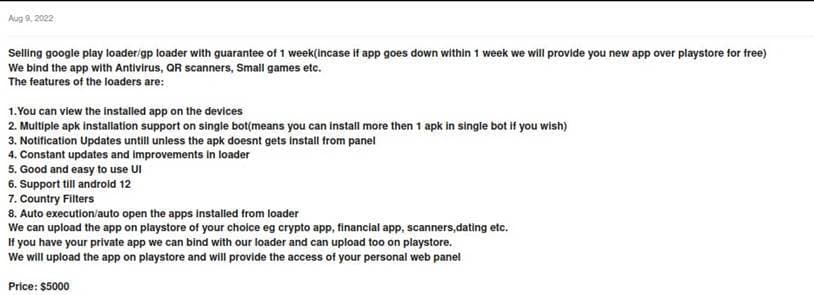Al igual que en los foros legítimos para vender bienes, también hay varias ofertas de la Darknet para distintas necesidades y clientes con diferentes presupuestos. Para publicar una aplicación maliciosa, los ciberdelincuentes necesitan una cuenta de Google Play y un código de descarga malicioso (Google Play Loader). Una cuenta de desarrollador se puede comprar a bajo precio, por US$200 y a veces incluso por tan solo US$60. El costo de los cargadores maliciosos varía entre US$2,000 y US$20,000, dependiendo de la complejidad del malware, la novedad y prevalencia del código malicioso, así como las funciones adicionales.