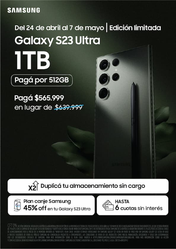 Samsung presenta en Argentina una nueva versión del Galaxy S23 Ultra, ahora con 1TB (1024 GB) de almacenamiento interno, y con un beneficio por tiempo limitado (Fuente Samsung Argentina).