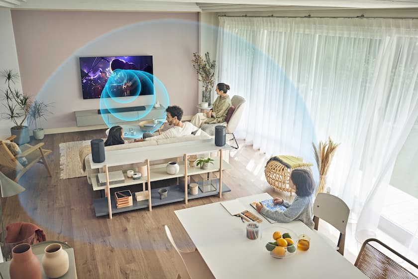 Para disfrutar de una experiencia de sonido aún más personalizada, la HT-A3000 está equipada con la tecnología Sound Field Optimization. Sus micrófonos integrados, miden de forma inteligente la altura y anchura de la habitación, así como la posición del subwoofer opcional y los altavoces traseros complementarios. También optimiza el sonido para que se adapte perfectamente a su distribución. Podrás disfrutar de Sound Field Optimization con o sin altavoces opcionales, solo tenés que activar el sencillo proceso de calibración durante la configuración inicial o desde el menú de inicio. La barra de sonido también está configurada con Vertical Surround Engine y S-Force PRO Front Surround para crear un campo de sonido horizontal y vertical aún más amplio que llega a todos los puntos del lugar donde sea instalada.