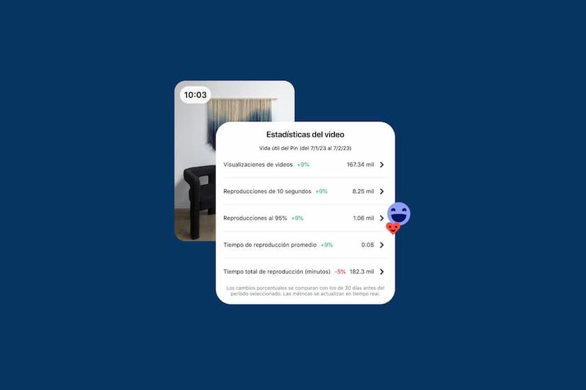 • Métricas de rendimiento: todos los Pines de video ahora tendrán métricas mejoradas (entre las que se incluyen vistas y tiempo de reproducción), lo que resultará en un conjunto de analytics consistente para todos los tipos de Pines.