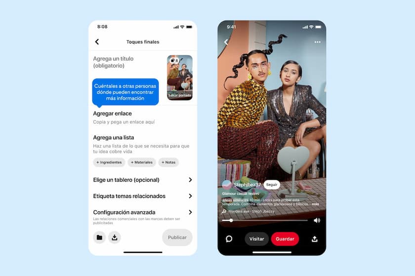 Dado el valor único de Pinterest para seleccionar mezclas de contenido de imagen y de video, la plataforma combinará los flujos de creación de contenidos de sus formatos más utilizados en una experiencia única y sencilla. Ahora, los usuarios de Pinterest podrán acceder a funciones que solo estaban disponibles en ciertos formatos de Pines o usuarios con cuentas para empresa, entre los que se incluyen enlaces, edición tras la publicación y relaciones de aspecto flexibles. Además, todos los creadores de contenido podrán incluir en sus Pines contenido expresivo como música, superposición de texto y stickers. Para crear Pines de video o imagen, los usuarios podrán «crear un Pin». Obtén más información sobre lo que ofrece un Pin en el Centro de asistencia de Pinterest.