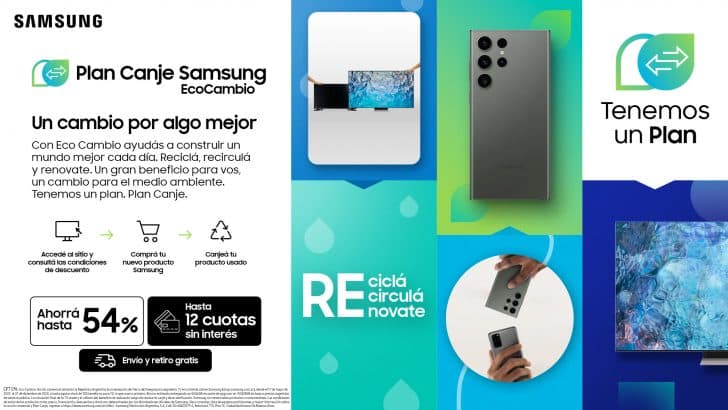 En contexto con el día mundial del medio ambiente, Samsung redobla la apuesta y anuncia la ampliación de su programa de Plan Canje con EcoCambio, que tiene como objetivo fomentar el intercambio consciente de dispositivos y reducir los desechos electrónicos. Este nuevo concepto, amplía los modelos de TV aceptados por el Plan Canje, ya sean productos de otras marcas o incluso con la pantalla rota, para permitirle a los usuarios que deseen comprar un nuevo TV Samsung, entregar sus dispositivos usados como parte de pago (Fuente Samsung Argentina).