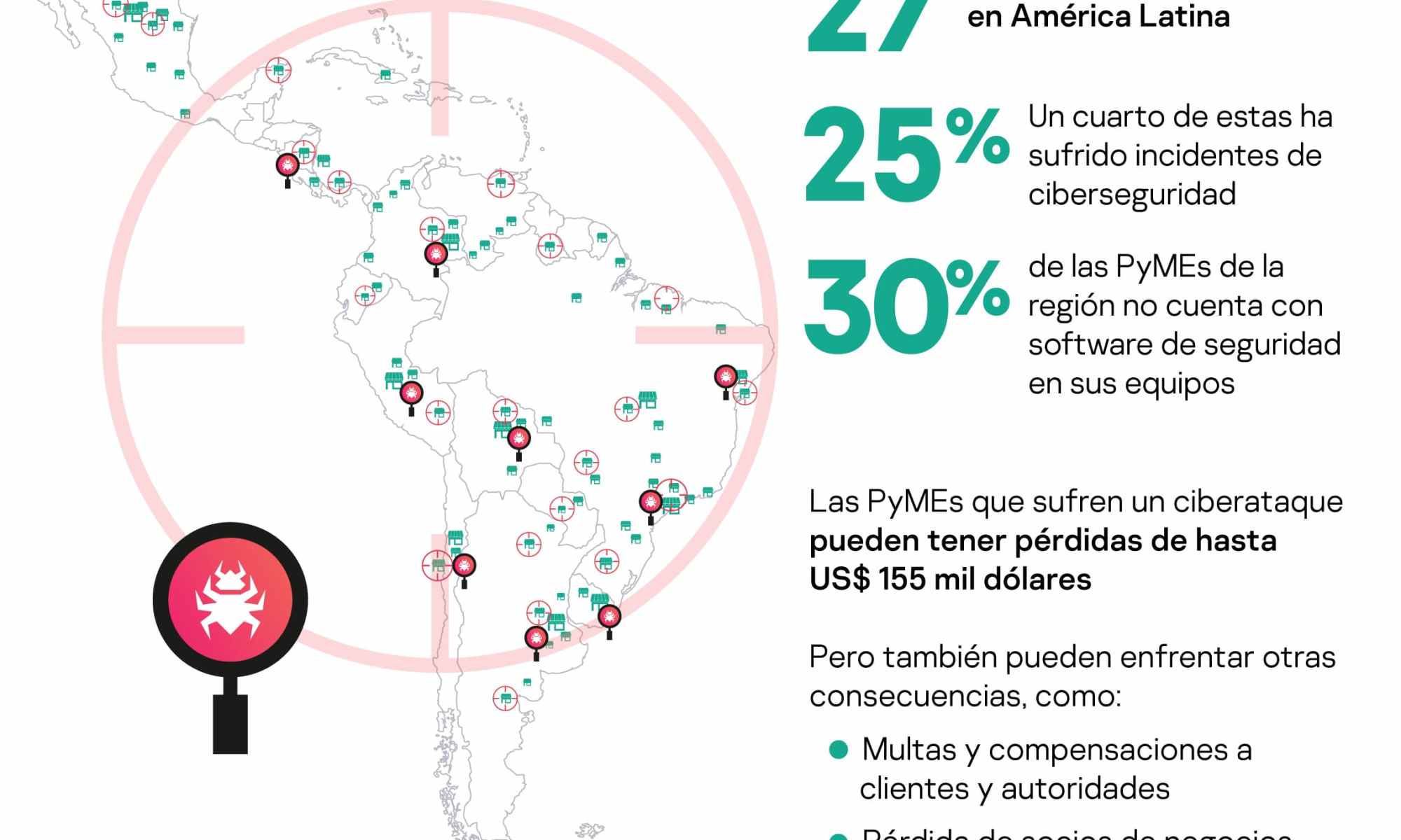 De acuerdo con un informe de Kaspersky, tras sufrir un ciberataque, las PyMEs pueden enfrentar pérdidas económicas de hasta $155 mil dólares, impactando en su reputación y generando daños que pueden comprometer sus operaciones y viabilidad. Las causas de estos ataques varían, pero entre estas está que, tradicionalmente, los emprendimientos no disponen de grandes presupuestos de ciberseguridad y la falsa idea de que este sector no es blanco de la ciberdelincuencia (Fuente Kaspersky Latam).
