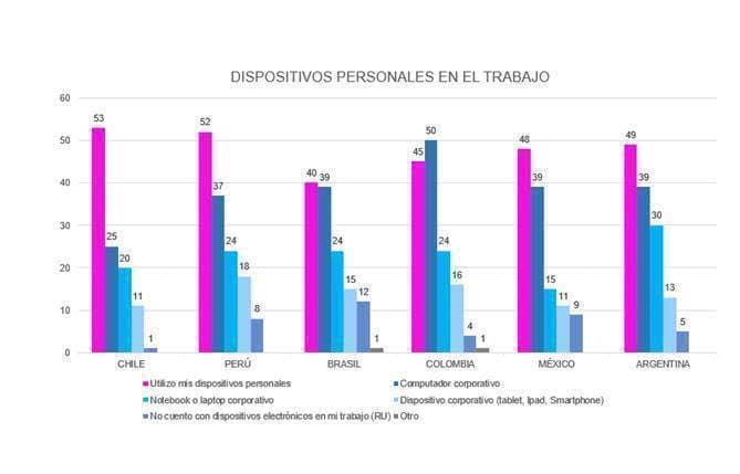 Estas cifras son parte del estudio de Kaspersky “Infodemia y los impactos en la vida digital”, donde queda de manifiesto que en la región, empleados de pequeñas y medianas empresas son seguidores de la tendencia BYOD, y Chile es el país en el que un mayor número de personas utilizan equipos personales en el trabajo (53%), seguido de Perú (52%), Argentina (49%), México (48%), Colombia (48%) y finalmente Brasil (40%). El hallazgo más relevante es que (86%) de los latinoamericanos usa sus propios smartphones o tablets para actividades laborales. Así lo hacen el 87% de argentinos, 88% de brasileiros, 89% de chilenos, 84% de colombianos, 89% de mexicanos y el 82% de peruanos.