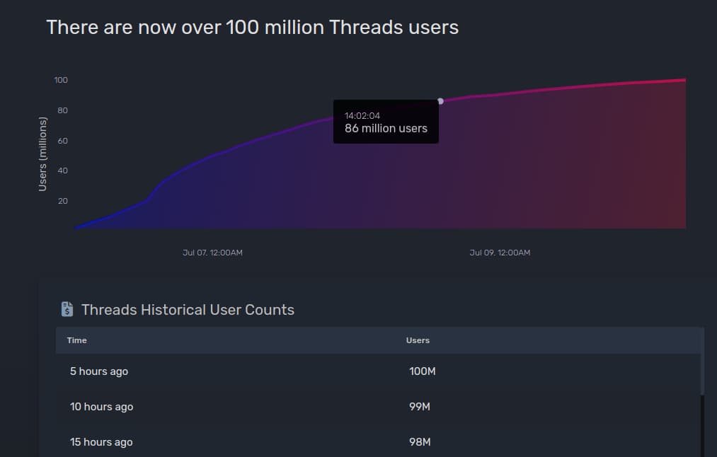 Si bien Threads en principio es un éxito rotundo de Meta, tal cual lo esta demostrando, que a menos de una semana y sin poder entrar en Europa por razones de privacidad, haya llegado a los 100 millones de usuarios, es sin duda un gran logro (Fuente Threads Trackers).
