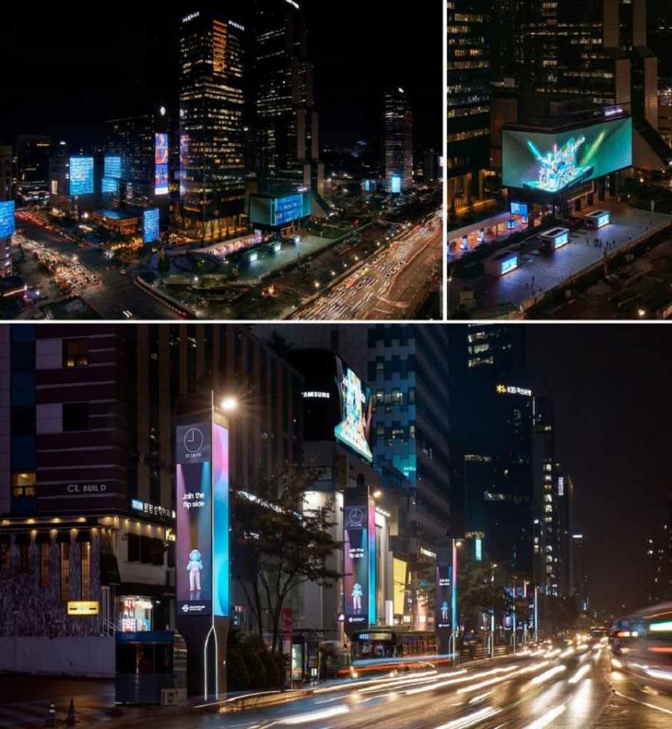 Los anuncios digitales en lugares públicos muestran el tema general de los productos que se presentarán en el Galaxy Unpacked de este año, al tiempo que invitan a los clientes a experimentar el “flip side” por sí mismos. Diecisiete anuncios digitales en lugares públicos se exhiben actualmente en diferentes lugares de 13 países: el distrito de Gangnam, la Torre de Seúl y COEX en Seúl (Corea); Times Square en Nueva York (EE. UU.); Piccadilly Circus en Londres (Reino Unido); CentralWorld en Bangkok (Tailandia); Tai Koo Li en Chengdu (China); y King Road Tower en Jeddah (Arabia Saudí).