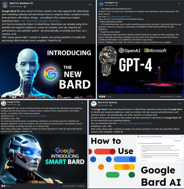 En primer lugar, los criminales crean páginas o grupos falsos en la red social suplantando algunas de las herramientas de IA más utilizadas, como ChatGPT, Bard o Midjourney. De esta manera, además de la propia captación de víctimas, los ciberdelincuentes logran que éstas interactúen con las publicaciones, ya sea a través de simples «Me gusta» o incluso compartiendo el contenido, asegurando un mayor alcance.