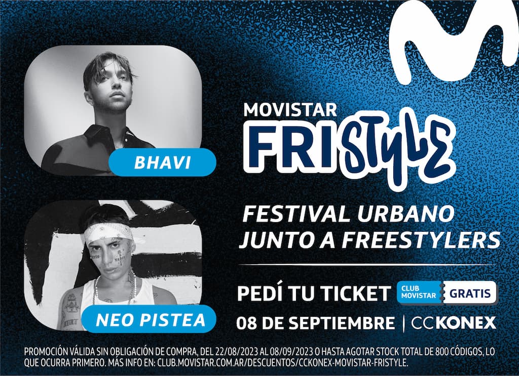 Esta es la 2da ocasión en la cual el Movistar FRIstyle toma forma de festival, presentando a varios artistas de distintas disciplinas del género urbano. Las freestylers más importantes de las ligas nacionales e internacionales, buscarán sorprender una vez más con sus rimas. Por su parte, tanto Bhavi como Neo Pistea, dos artistas de los grandes artistas nacionales del género urbano, que han trascendido fronteras, nos brindarán un show exclusivo en la Ciudad Cultural Konex para todos los clientes Movistar.