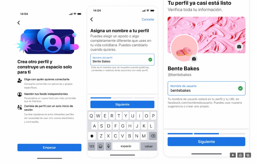 Sin importar si es la primera vez que usas Facebook o si ya cuentas con bastante experiencia en la plataforma, tal vez quieras mantener separadas tus relaciones personales y profesionales, o quizá prefieras que un perfil esté asociado a una comunidad a la que perteneces y que otro sea solo para amigos. Crear varios perfiles personales te permite organizar fácilmente con quién compartes contenido y qué ves en relación con los diferentes aspectos de tu vida. Podrías tener un perfil para tu pasión por la comida y otro, para ponerte al día con tus amigos y familiares (Fuente Meta Argentina).