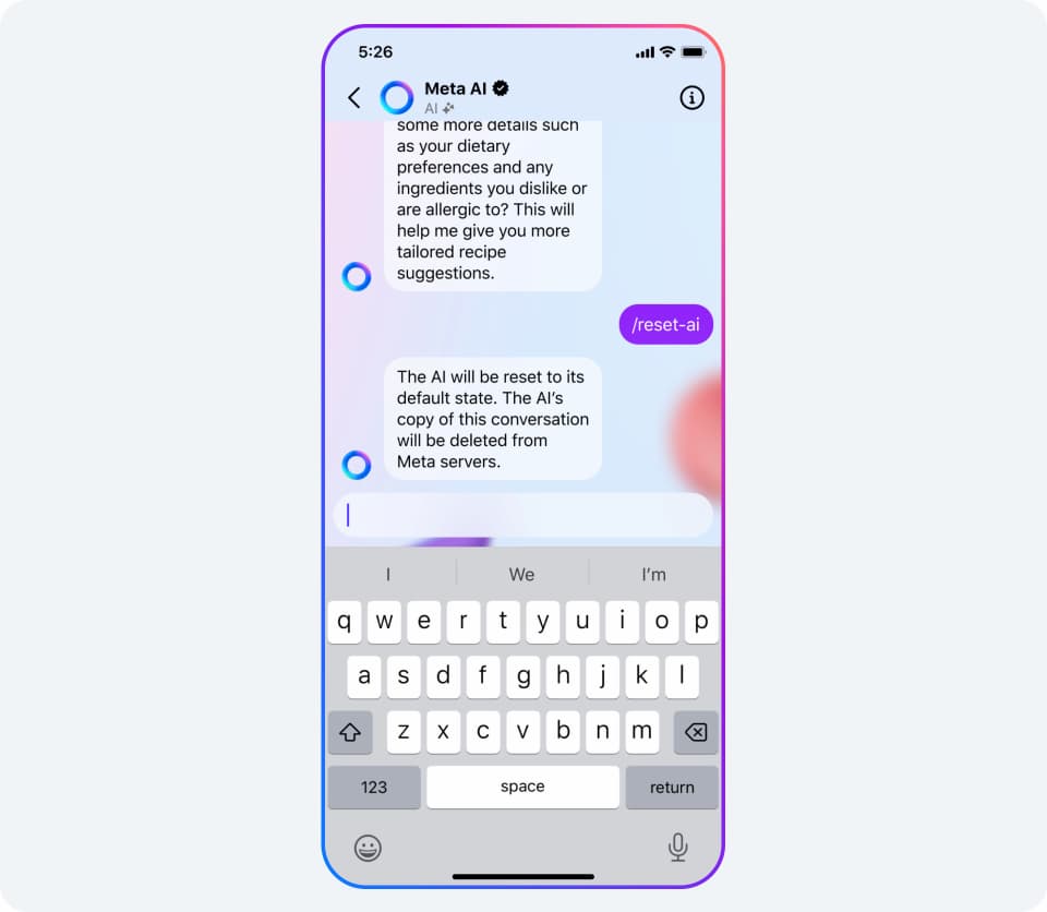 Para brindarte más control, hemos integrado comandos que te permiten eliminar información compartida en cualquier chat con una IA en Messenger, Instagram o WhatsApp. Por ejemplo, puedes eliminar tus mensajes de IA escribiendo «/reset-ai» en una conversación. El uso de una función de IA generativa proporcionada por Meta no vincula la información de tu cuenta de WhatsApp con la información de tu cuenta en Facebook, Instagram ni ninguna otra aplicación proporcionada por Meta.