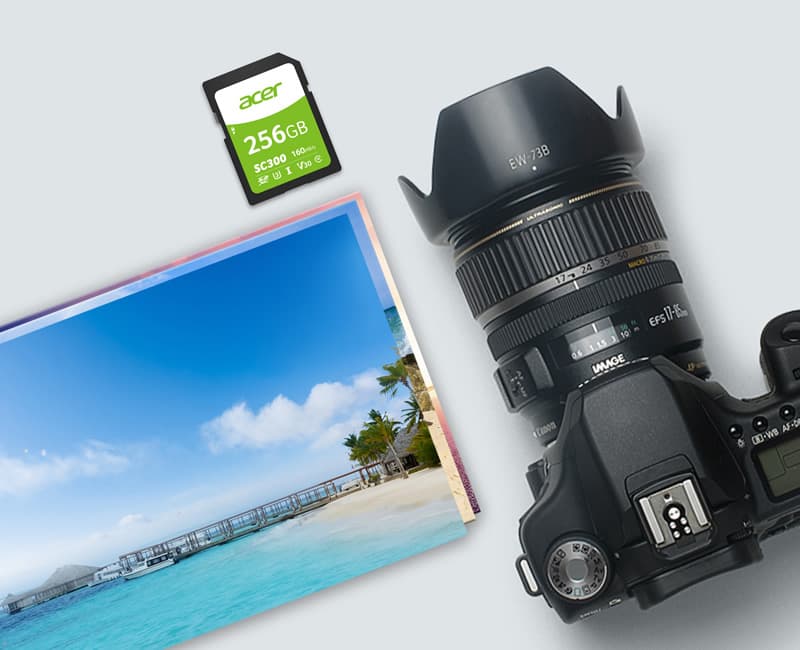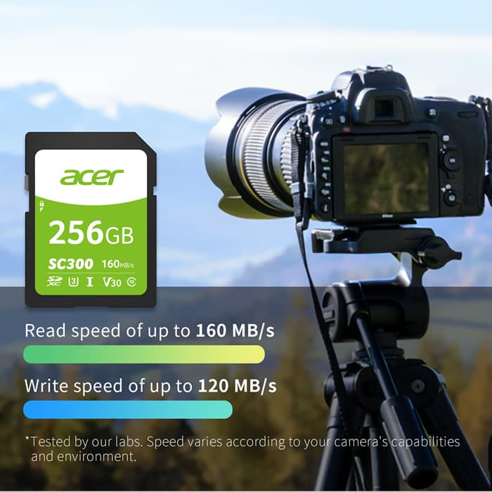 Las tarjetas de memoria flash SC900 de Acer cumplen con el estándar SDXC UHS-II y garantizan un nivel de rendimiento capaz de responder a altas exigencias. Sus velocidades de lectura de hasta 300 MB/s y de escritura de hasta 260 MB/s permiten manejar archivos de video de gran tamaño con rapidez y facilidad.
