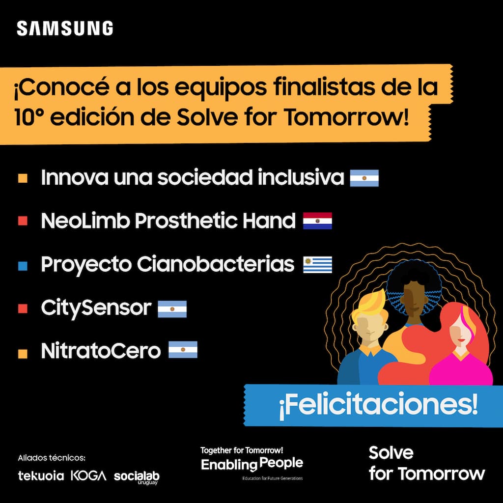 El programa educativo Solve for Tomorrow (Soluciones para el Futuro) anunció los 5 equipos seleccionados que pasarán a la siguiente instancia de preparación para la final. Los proyectos finalistas de la 10° edición, presentaron soluciones innovadoras a problemáticas relacionadas al cuidado del medio ambiente y la inclusión social en sus comunidades. Las propuestas seleccionadas fueron (Fuente Samsung Argentina):