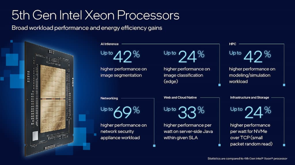 Desarrollados a partir de generaciones anteriores, los procesadores Xeon de 5ª generación aportan innovaciones que mejoran el rendimiento y la eficiencia de los clientes. Los procesadores Xeon de 5ª generación admiten hasta 64 núcleos por CPU y casi 3 veces el caché máximo de último nivel de la generación anterior. Ofrecen ocho canales de DDR5 por CPU, admiten DDR5 a hasta 5.600 megatransferencias por segundo (MT/s) y aumentan el ancho de banda entre zócalos con Intel UPI 2.0, ofreciendo hasta 20 gigatransferencias por segundo (GT/s). Determinadas unidades basadas en procesadores Xeon de 5ª generación admitirán flujos de trabajo CXL de tipo 3 a través de los principales proveedores de servicios en la nube (CSP).