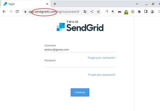 Al enviar correos electrónicos de phishing directamente a través del ESP, los atacantes aumentan la probabilidad de éxito, aprovechando la confianza de los destinatarios en las comunicaciones de fuentes conocidas. Los correos electrónicos de phishing parecen provenir de SendGrid, expresando preocupación por la seguridad de las cuentas e instando a los destinatarios a habilitar la autenticación de dos factores (2FA). Sin embargo, el enlace proporcionado redirige a los usuarios a un sitio web fraudulento que imita la página de inicio de sesión de SendGrid, donde se recopilan sus credenciales.