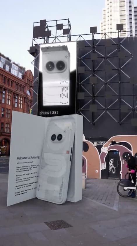 A todo esto se suma la campaña teaser de Nothing por todo Londres y uno específico cerca de Old Street, donde tiene la nueva cámara del dispositivo y una elegante interpretación AR del dispositivo en su caja de venta.