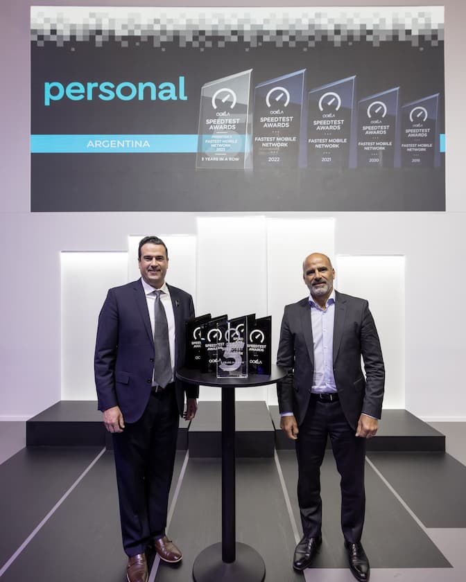 Personal Argentina, empresa de servicios de conectividad fija y móvil de Telecom Argentina, fue galardonado por Ookla, en el marco del Mobile World Congress 2024 en Barcelona, con el premio a la Red Móvil Más Rápida de Argentina, por 5 años consecutivos, según el último reporte 2023 con una velocidad de conexión de 36.59 megas. Personal es el primer operador en América Latina en obtener esta distinción por 5 años consecutivos (Fuente Personal Argentina).