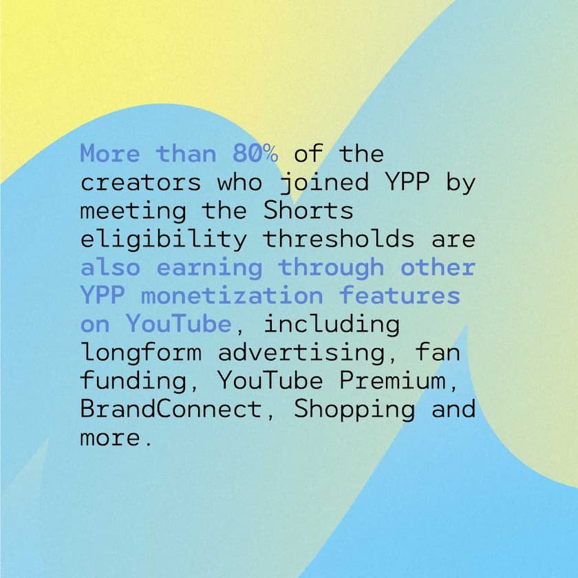 De los creadores que se unieron al Programa de Socios de YouTube (YPP) al cumplir con los requisitos de elegibilidad de Shorts, más del 80% ahora también obtienen ganancias a través de otras funciones de monetización, ya sea con publicidad en videos de formato largo, funciones de financiación de fans o fan funding, YouTube Premium, BrandConnect, Shopping y más. Con un promedio de más de 70 mil millones de visualizaciones diarias en Shorts y nuevas vías para ganar dinero, la cantidad de canales que suben Shorts ha crecido un 50% año tras año.