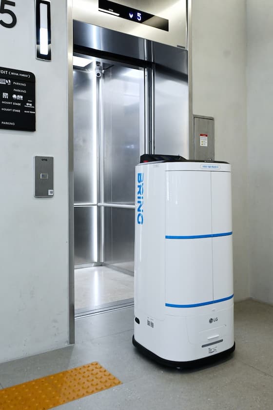 A partir de este mes, LG Electronics lanzará su robot de entrega autónomo con IA, ‘LG CLOi ServeBot’, en ‘BRING’, un servicio de entrega de robots lanzado por Kakao Mobility por primera vez dirigido a diversos espacios de edificios, como grandes oficinas, hoteles, apartamentos y hospitales, tipo doble puerta).