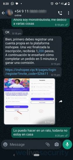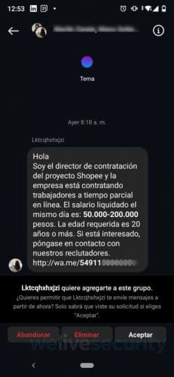 Los estafadores comienzan la estafa incluyendo a la víctima en una especie de grupo de difusión de Instagram donde alguien se presenta como “Director de Contratación de Shopee” y ofrece un trabajo por sumas de entre 50.000 y 200.000 pesos argentinos por día. Una vez que logra captar la atención, invita a los interesados a comunicarse con un número de WhatsApp (según su código telefónico está radicado en Buenos Aires, Argentina).