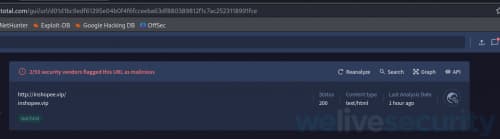 Finalmente, si bien no se avanzó con la transferencia, desde ESET buscaron información de inshopee y no existe ninguna información al respecto, ni de su origen y tampoco se puedo rastrear el IP de la página con herramientas simples. Haciendo un examen de la URL en virus total, indica que es potencialmente malicioso.