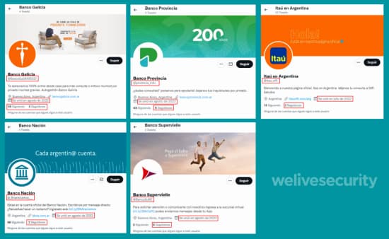 Hay múltiples ejemplos en Twitter e Instagram que evidencian como los estafadores monitorean los comentarios que hacen los usuarios con ciertas palabras clave o cuando etiquetan a un perfil verificado. Se valen de la urgencia que generalmente llevan estos mensajes (suelen ser reclamos o algún tipo de inconveniente a resolver) y a través de estos perfiles falsos (sin marca de verificación) envían mensajes directos haciéndose pasar por la cuenta oficial del banco. Tal es así que utilizan el mismo logo y una variación del nombre oficial, y hasta ofrecen el contacto del servicio de atención al cliente o bien piden un número de contacto. Finalmente, las víctimas son contactadas por falsos representantes de atención al/la cliente que buscarán extraer información, como claves de acceso, tokens u otros datos para poder acceder a sus cuentas y vaciarlas.