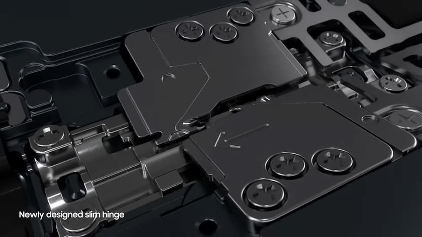 Rediseñada para ser un 21% más liviana que su predecesora, la nueva bisagra del Galaxy Z Fold4 se adaptaba a un ancho más amplio y a una longitud más corta de la pantalla de cubierta. Mientras que el plegable anterior de la serie usaba engranajes entrelazados para garantizar un plegado y despliegue uniforme de la pantalla, el Galaxy Z Fold4 cambió el movimiento de la bisagra de giratorio a lineal. Este ajuste redujo drásticamente el peso, el grosor y el número de piezas, lo que agilizó la fabricación y mejoró la resistencia del dispositivo. Con el Galaxy Z Fold4, Samsung construyó su bisagra más delgada y liviana en ese momento, manteniendo el mismo nivel de durabilidad que el formato anterior.