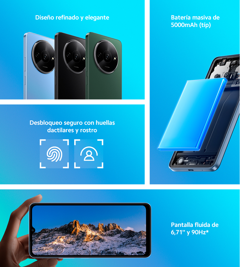 El Redmi A3 soporta características de seguridad avanzadas, incluyendo Face Unlock y desbloqueo por huella digital mediante un sensor de huella lateral rápido y receptivo. Con un conector de auriculares de 3.5mm, el modelo también está equipado con un puerto de carga USB Tipo-C de 10W. Está dotado de una gran batería de 5000mAh asegura rendimiento hasta 29 horas de tiempo de llamada y hasta 17 horas de reproducción de video.