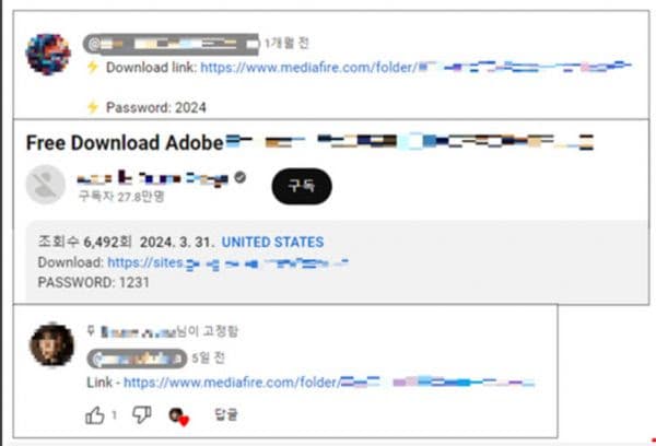 En cada uno de los casos compartidos por ASEC, se evidencia una misma práctica por parte de los actores maliciosos: la de añadir un enlace comprometido de descarga en la descripción o en la sección de comentarios de un vídeo sobre la versión crackeada de programas como por ejemplo Adobe.