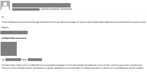 El primer paso de este tipo de ataque consiste en que las víctimas reciban correos electrónicos supuestamente de una empresa de auditoría legítima. Estos correos se envían desde una dirección auténtica, que muy probablemente ha sido hackeada por los atacantes. Para ello, utilizan tácticas de ingeniería social para bajar la guardia de las víctimas y prepararlas para recibir un archivo de Dropbox.