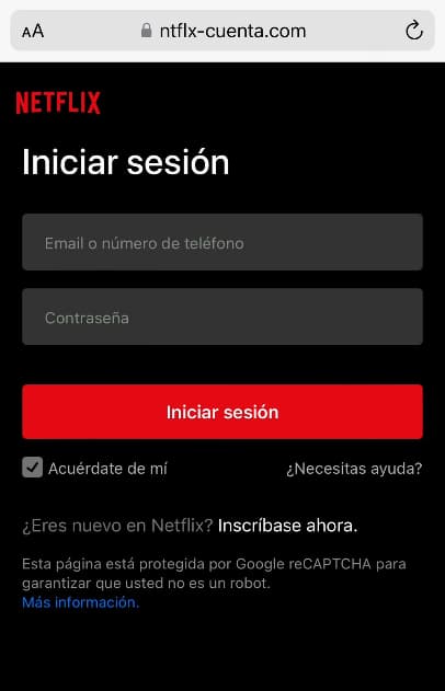 Ejemplo de la página falsa para robo de credenciales de Netflix.