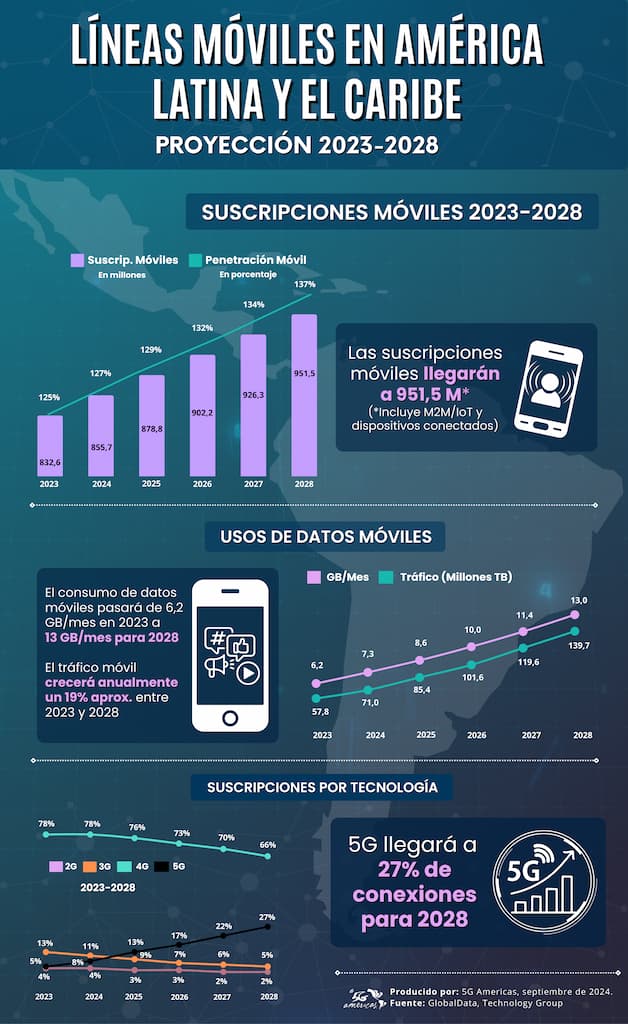 También las suscripciones móviles continuarán en aumento durante los próximos cuatro años. GlobalData proyecta que América Latina y el Caribe llegarán a los 951,5 millones de suscriptores móviles para 2028, para alcanzar una penetración móvil del 137 por ciento sobre el total de población de la región. Este número incluye dispositivos conectados y también líneas de comunicaciones máquina a máquina (M2M) y/o Internet de las Cosas (IoT). En 2023, el total de suscripciones móviles era de 832,6 millones, para una penetración del 125 por ciento de la población.