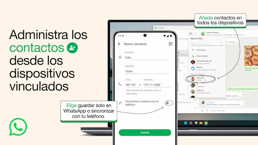 Hasta ahora, el único lugar donde se podía añadir contactos era desde el dispositivo móvil, ya sea al escribir un número de teléfono o escanear un código QR. Pronto se podrá añadir y administrar contactos desde la comodidad del teclado en WhatsApp Web y Windows, y más adelante se podrá hacer desde otros dispositivos vinculados.
