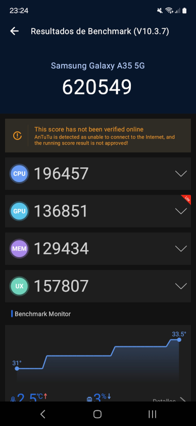 El Samsung Galaxy A35 cuenta con una pantalla Super AMOLED de 6.6 pulgadas con tasa de refresco de 120Hz. Internamente cuenta con el procesador Exynos 1380 junto con 8GB de RAM y hasta 256GB de almacenamiento, sumado una batería de 5000 mAh con soporte para carga rápida de 25w. En cuanto a fotografía, el Galaxy A35 tiene una cámara triple en su posterior con un sensor principal de 50MP y una cámara selfie al frente de 13MP, completando sus características con lector de huellas bajo pantalla, parlantes stereo y resistencia al polvo y agua IP67.