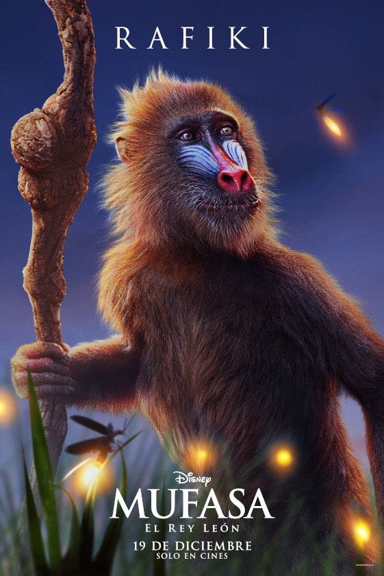 El sabio chamán, Rafiki, es quien narra la nueva historia de origen de Mufasa. En el film, la destinataria del relato es Kiara, hija de Simba y Nala y única nieta del rey. Con su risa inconfundible, desconcertante y contagiosa, este carismático babuino sella desde el comienzo un vínculo especial con Mufasa que durará toda la vida. Rafiki cobra vida con la voz original en inglés de John Kani.