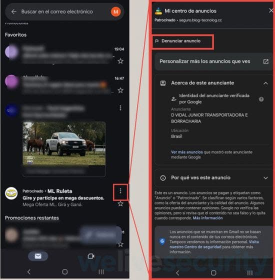 • Verificar el remitente: haciendo click en los tres puntos en la esquina superior del mensaje, se puede acceder al centro de anuncios de Google y allí revisar el remitente o anunciante.