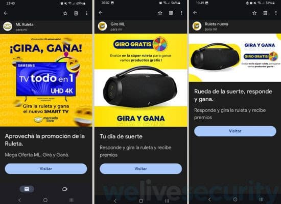 Los remitentes de estos correos electrónicos incluyen nombres como “ML ruleta”, “Ruleta Nueva”, “Gire ML”, “ML Online”, y utilizan el logotipo y los colores característicos de la marca, para generar confianza haciéndose pasar por MercadoLibre. En los tres casos identificados, figuran empresas brasileñas como anunciantes de los correos y no MercadoLibre.