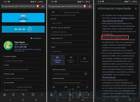 Si la víctima es engañada a realizar la supuesta compra, es llevada a la plataforma de pagos para emprendedores Hotmart que, si bien se trata de una plataforma legítima para compraventa, el formulario de pago presenta un botón falso de MercadoPago (la billetera virtual de MercadoLibre).